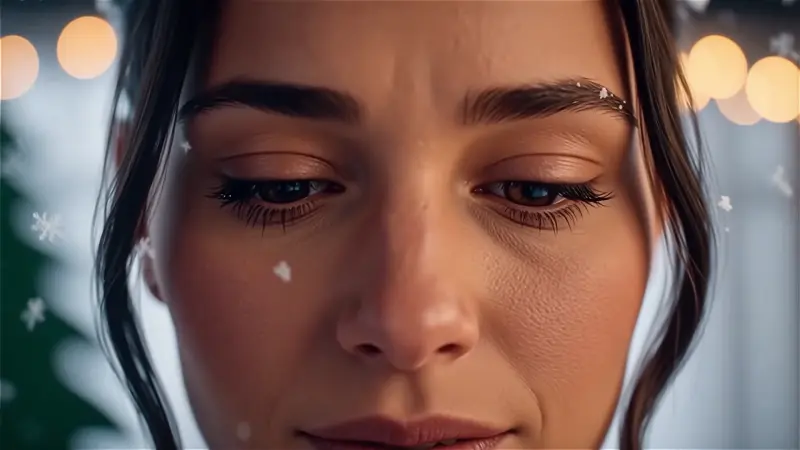 3–5 second cinematic Christmas video clip. Close-up of a character’s face as snow falls slowly in front of lens. Subject looks down, then lifts eyes with subtle emotional shift—hope, gratitude, memory. Background out of focus: warm Christmas lights and a softly glowing tree. Camera performs a gentle dolly-in, micro handheld realism. Snow particles drift naturally with gravity and air resistance. Lighting: warm tungsten key from tree lights, cool blue fill from snowy night, soft rim light catching falling snow. Film grain, slight motion blur, realistic eye reflections. Emotional, quiet, human.