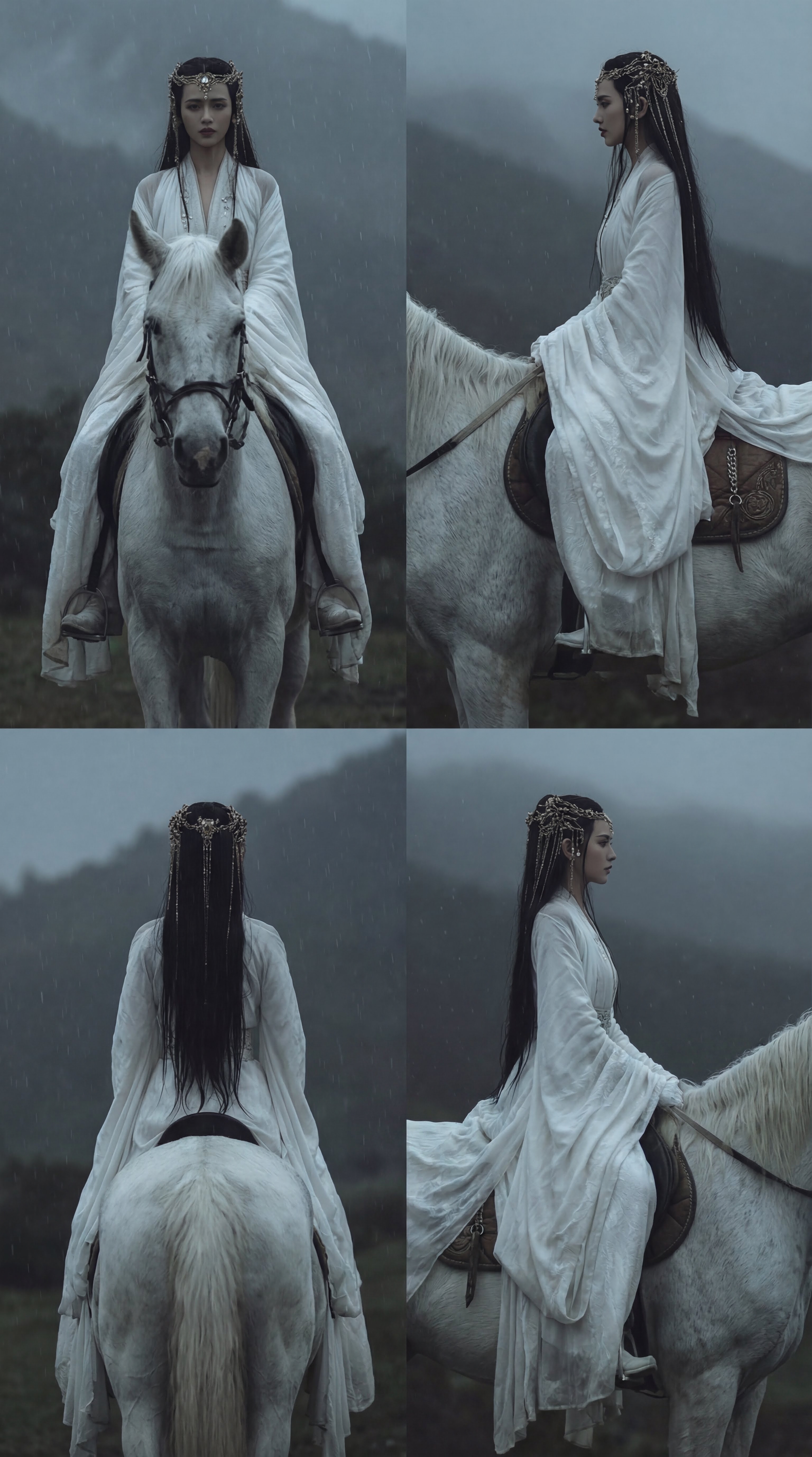 根据参考图片,生产女角色的正面、侧面、背面的全身像,电影分镜方式,制作成不同角度拍摄的4格分镜网格,画面风格跟质感要保持跟原来的图片一致