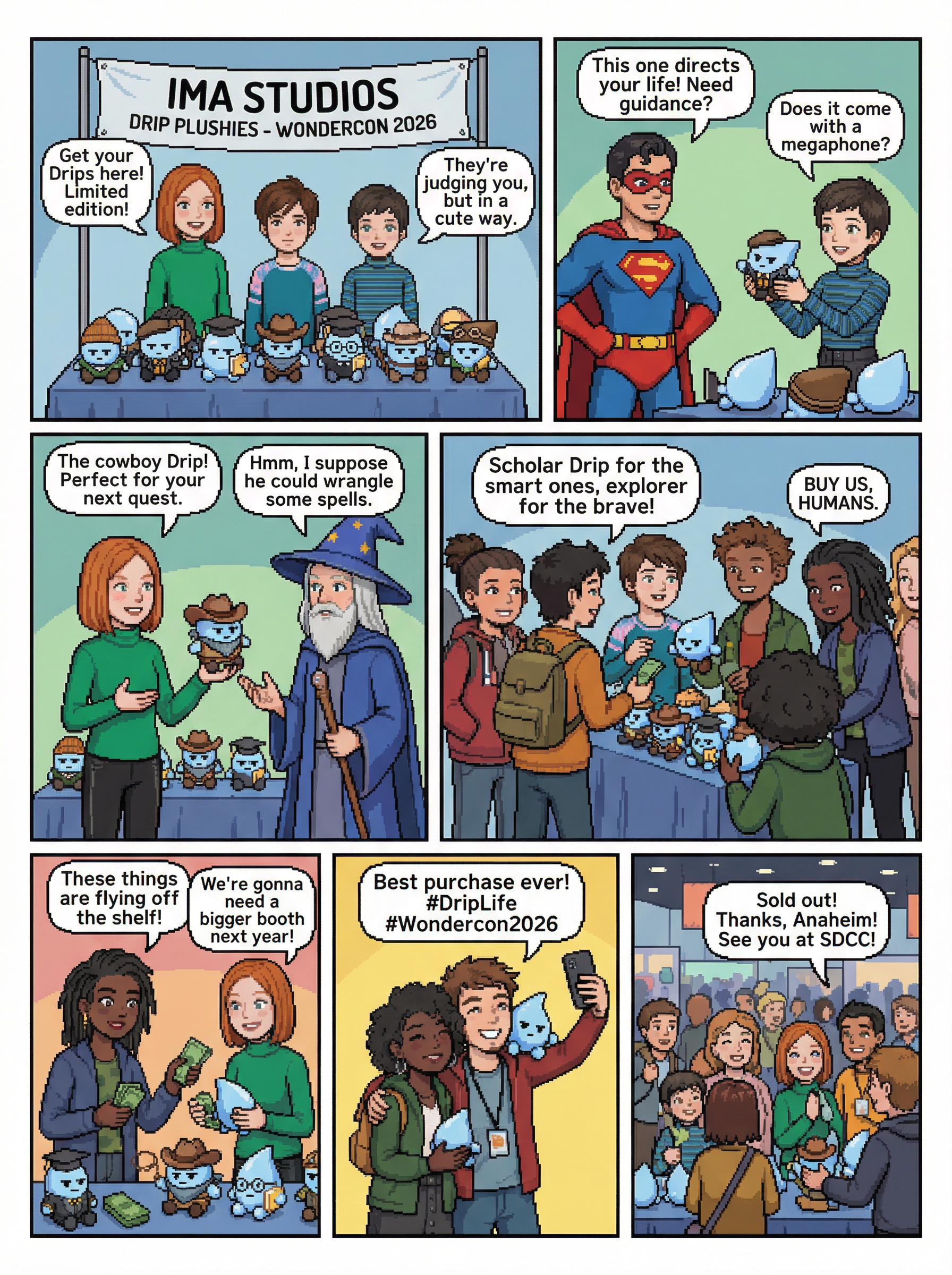 subject: three sisters (first upload) replacing people from second upload with same style from second upload. story: the sisters selling Ima Studios' Drip plush toys (from third and fourth upload) to several volunteers at Wondercon 2026 in Anaheim California, funny texts, conversational. style: seven panel comic book story, modern, comedic. setting: Wondercon 2026 in Anaheim California.