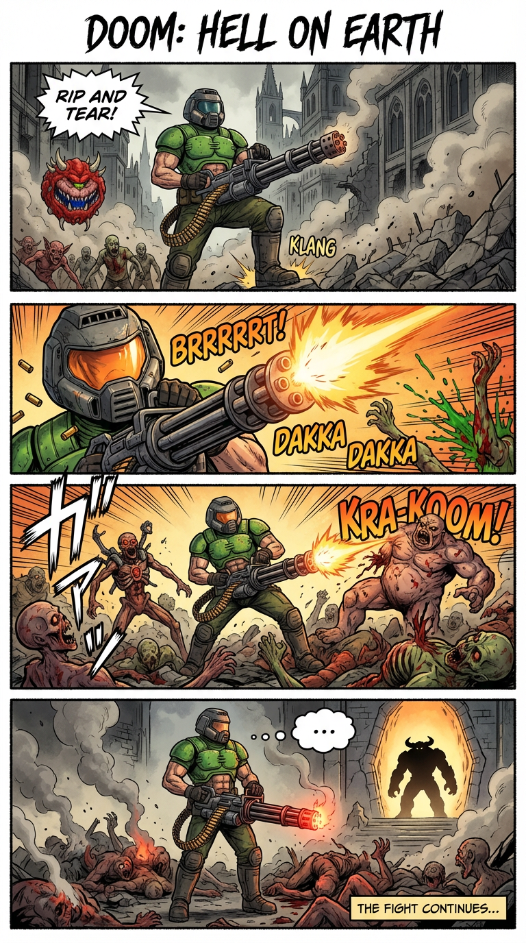Manga-style comic story with multiple panels showing Doomguy from Doom 2 using chaingun against demons, non-pixelated art style