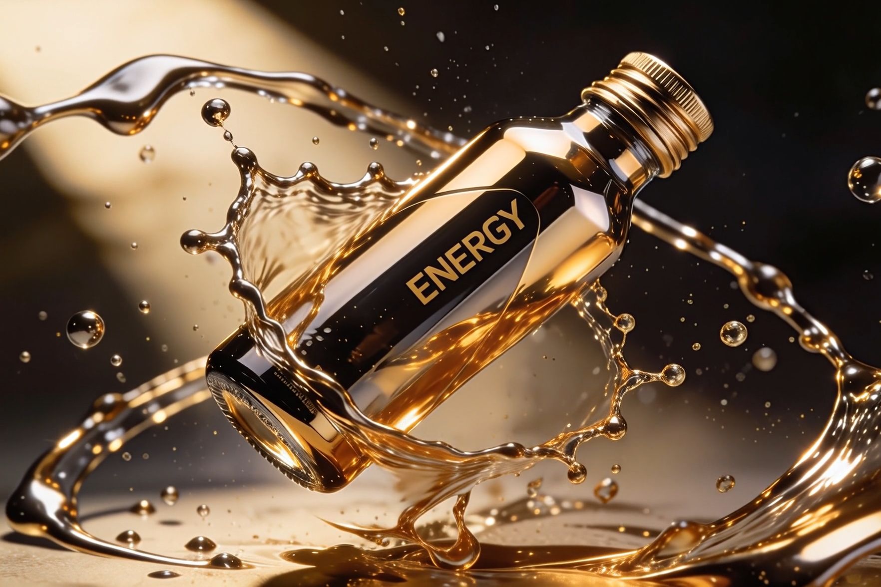 close-up of a perfect energy bottle floating in the air with mid-splash of metallic liquid, frozen motion, mercury and gold droplets caught in zero gravity, hyper-crisp detail on liquid tension, dramatic side lighting, luxurious chaos, editorial beauty video