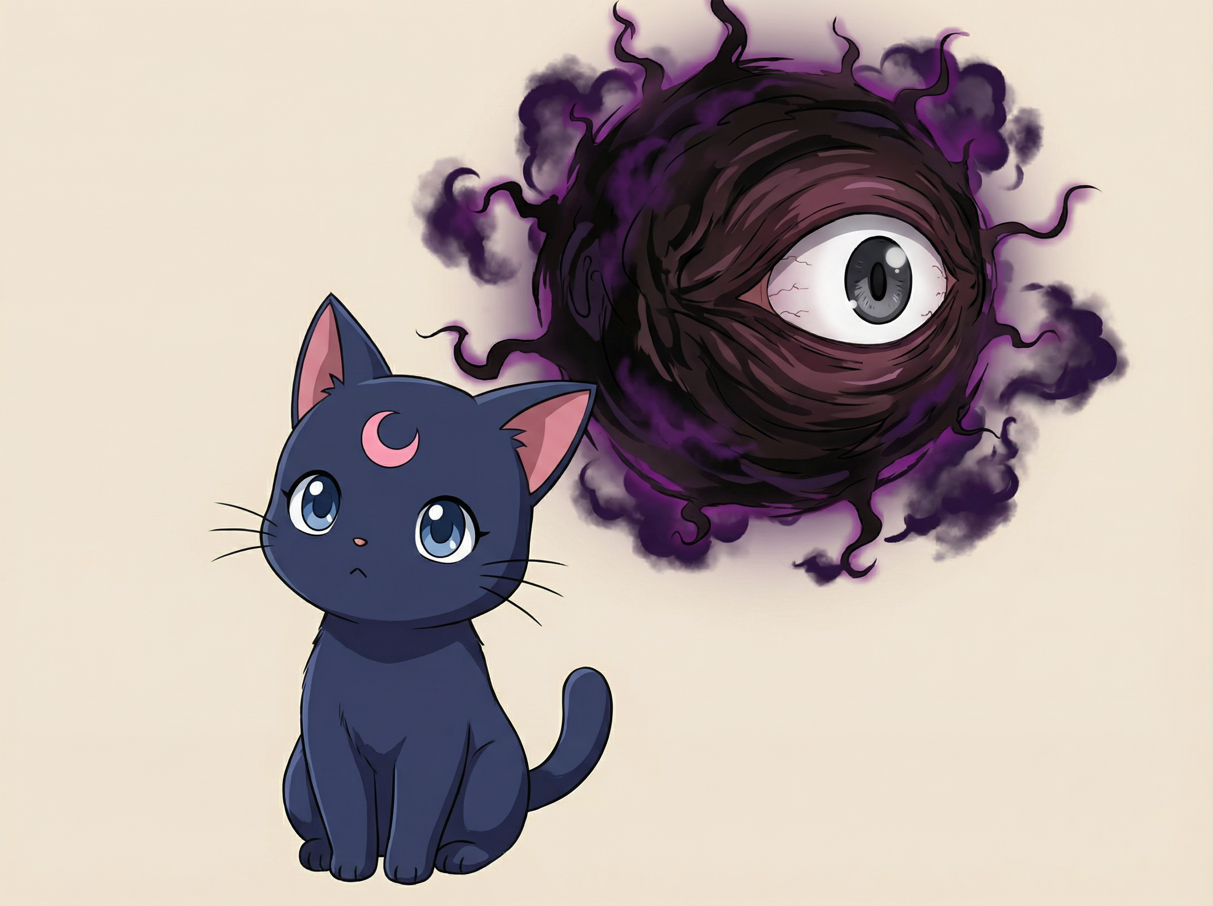 根据像素画还原出这个小黑猫的二次元形象立绘,右上方是被污染的暗物质眼魔月亮散发着不详的暗能量,纯色易去底色背景,小猫要呆呆地像是小乖猫