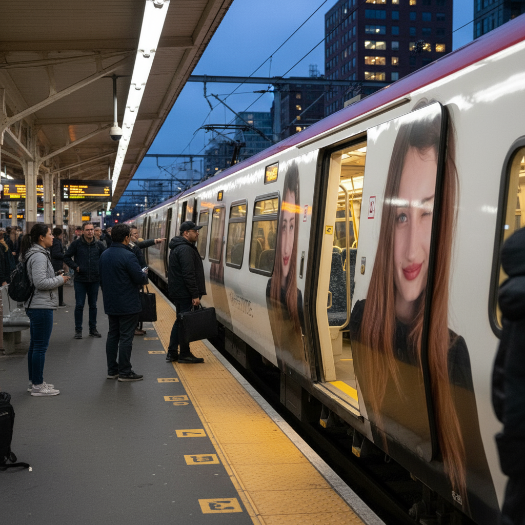 A photorealistic wrapped train stopped at a station platform with people standing on the platform, featuring characters from the uploaded image painted on the side of the train while maintaining the original character design, style, and touch. Output images only, no text.