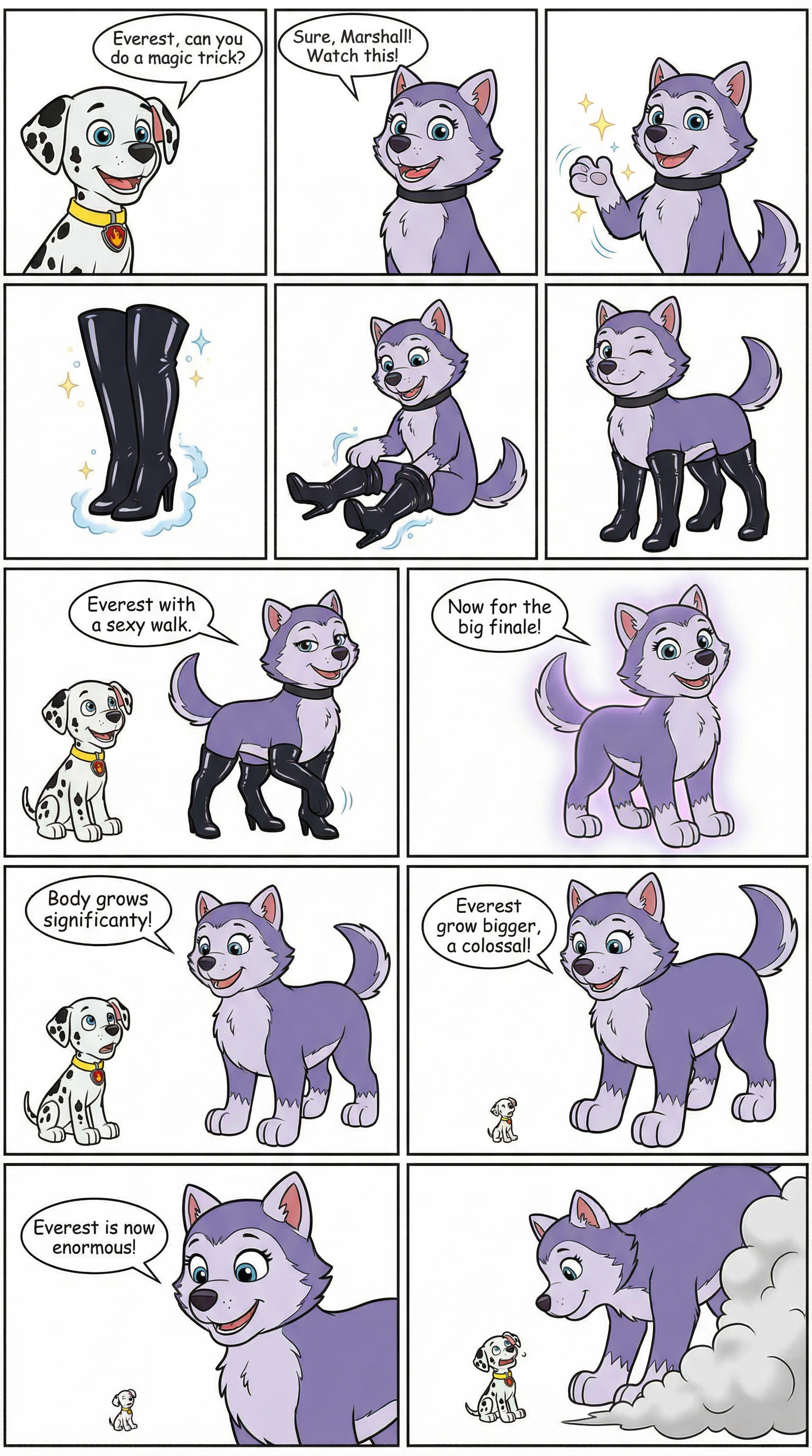 12 part comic image Marshall ask Everest do a magic trick then Everest magical pull out slim sexy latex thigh heels boots and then Everest magical pull on all feet and then Everest sexy walk growth huge then Everest magical growth colossal size then Everest entirely body size growth enormous size