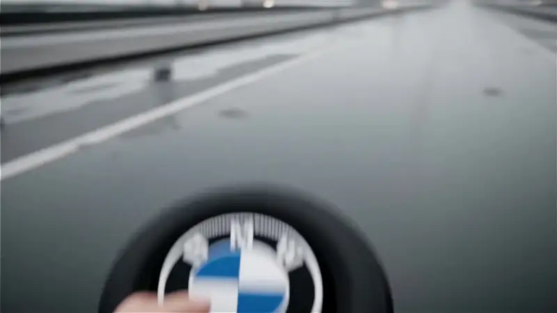 First-person POV tossing a BMW patch on wet asphalt. The patch hits the ground and becomes a solid black tire. The camera orbits 360 degrees around the tire as a matte black BMW 4er Coupé M mechanically assembles around it. The tire remains visible as the front-left wheel. Chassis extrudes sideways, matte black panels snap on. Realistic transformers-style assembly. Upon completion, the car immediately accelerates and drives off into the distance on the wet pavement. Overcast.