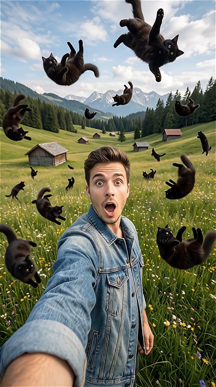 Start the video showing only the man smiling while taking a selfie, then have the cats rain from the sky, surprising the man, before they all land and stroll away.