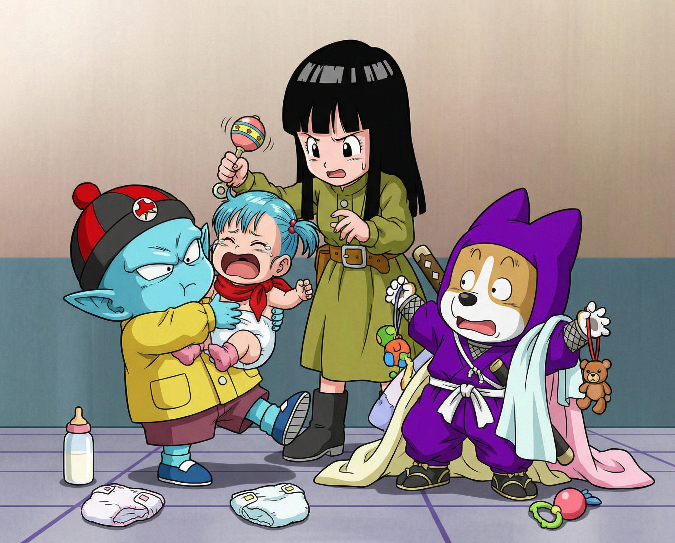 The Kid Pilaf Gang struggling with a baby version of Bulma