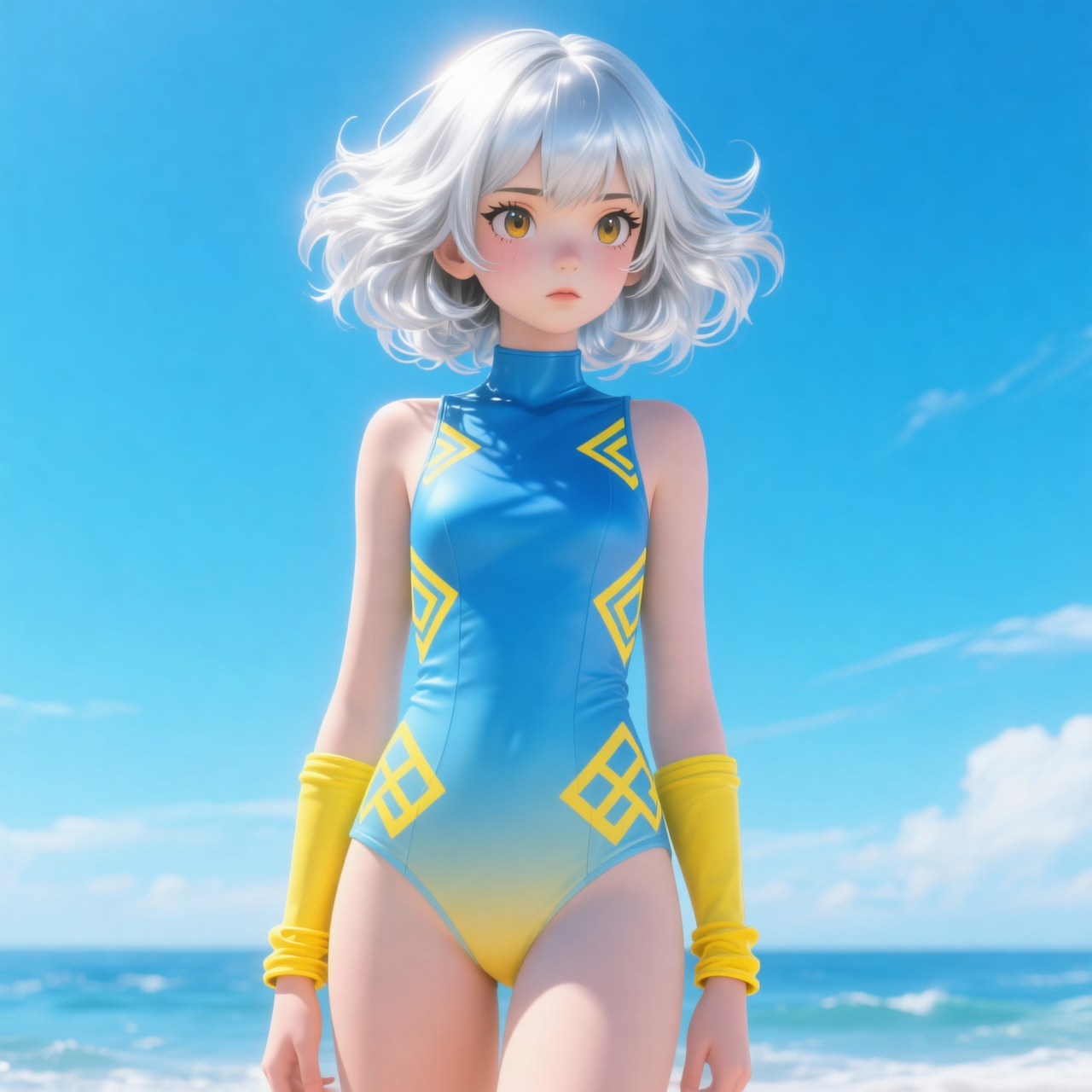 vertical 9:16, 3D anime summer retro-futuristic style, hyper-detailed render, a young girl with silver-white voluminous hair, sharp facial features. Wears a gradient blue cropped bodysuit with yellow geometric prints, yellow arm cuffs. Background: pure cerulean blue sky, soft ocean breeze, airy通透 glow. Style: high-saturation sky-blue + golden yellow, soft rim light on hair, hyper-detailed fabric sheen, clean composition, cinematic summer vibe