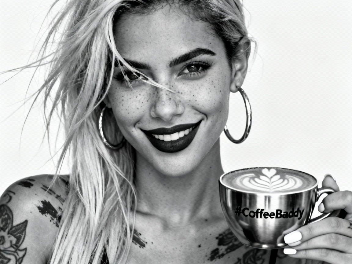 monochromatic black and white photograph, a close-up studio portrait of an incredibly beautiful tattooed sleek slim Latina supermodel with tanned skin and light freckles across her nose and cheeks. She is looking directly into the camera with a cheeky, smirking expression. Her hair is long silver-platinum wild one-sided with a strand in her face. She is wearing a bold, matte dark lipstick. Her manicure is bright light fake fingernails. She has big golden hoop earrings. Her hand holds a metallic cup of coffee with the text "#CoffeeBaddy" with perfect latte art. The background is pure white. Lots of imperfections