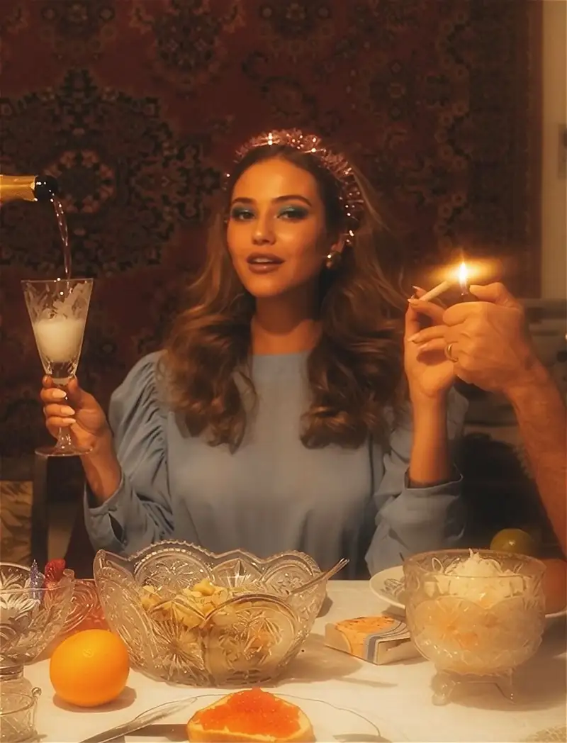 She smiles warmly, the golden fairy lights glowing softly around her. Leaning slightly closer, her voice drops into a delicate whisper: *“hi… you look so cozy here with me… just breathe in… and let everything go…”* Her words melt gently into the festive silence, the soft sparkle of lights and flowers making the ASMR moment feel intimate, calm, and comforting.