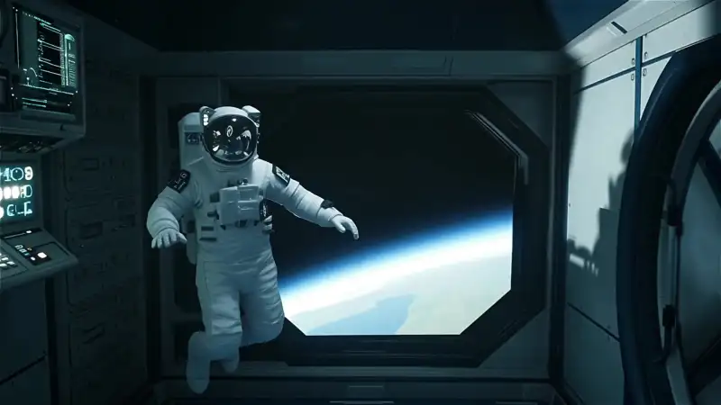 Astronaut floats through zero-gravity inside a space station, flickering lights hint at danger, holograms flash warnings in red, Earth slowly rotates outside the window, eerie ambient hum adds suspense.
