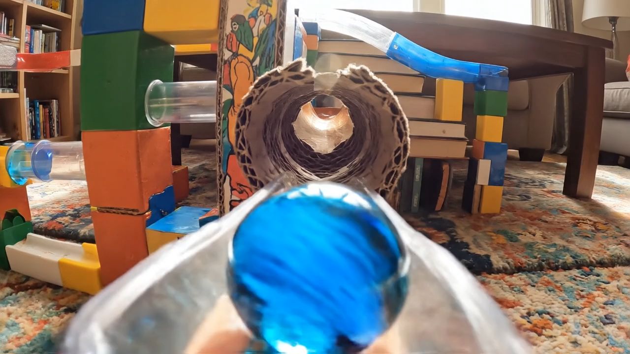 A polished glass marble, streaked with swirls of electric blue, barrels through a twisting DIY marble run. The ultra-low FPV camera hugs the course, matching every motion as the marble spirals through funnels, dives down transparent tubes, and launches from ramps into curved tracks. The course winds across a sunlit living room, built from cardboard, plastic tracks, and toy obstacles. Motion is thrilling, with every twist and bounce in perfect sync.