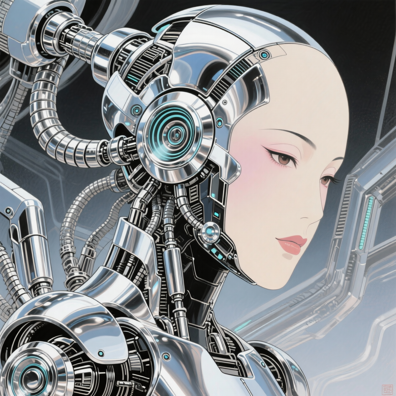Hajime Sorayama style artwork featuring robotic aesthetics and metallic textures
