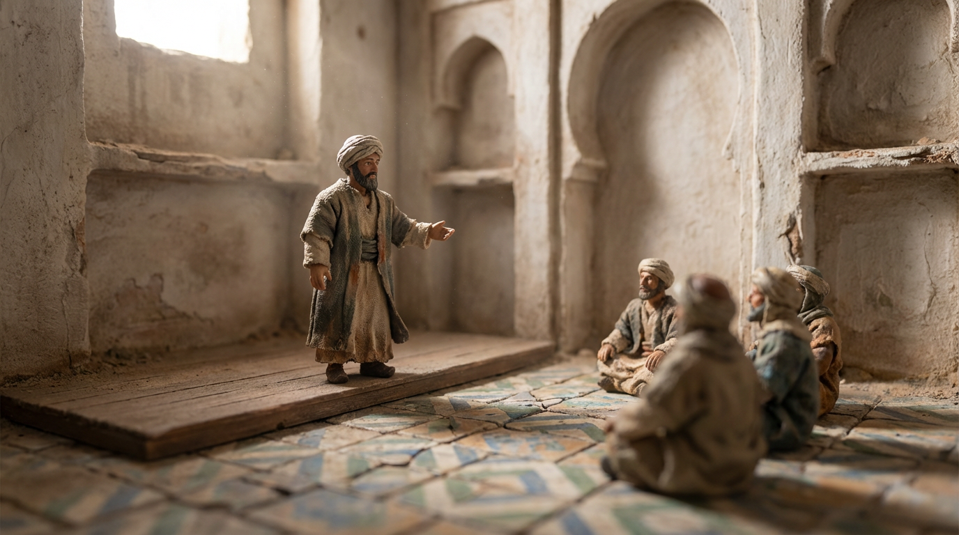 Medium-wide shot of a handmade toy figure representing Ibn Umayl, a 10th-century Arabic alchemist and scholar, standing slightly elevated as he teaches to a small gathering of listeners.