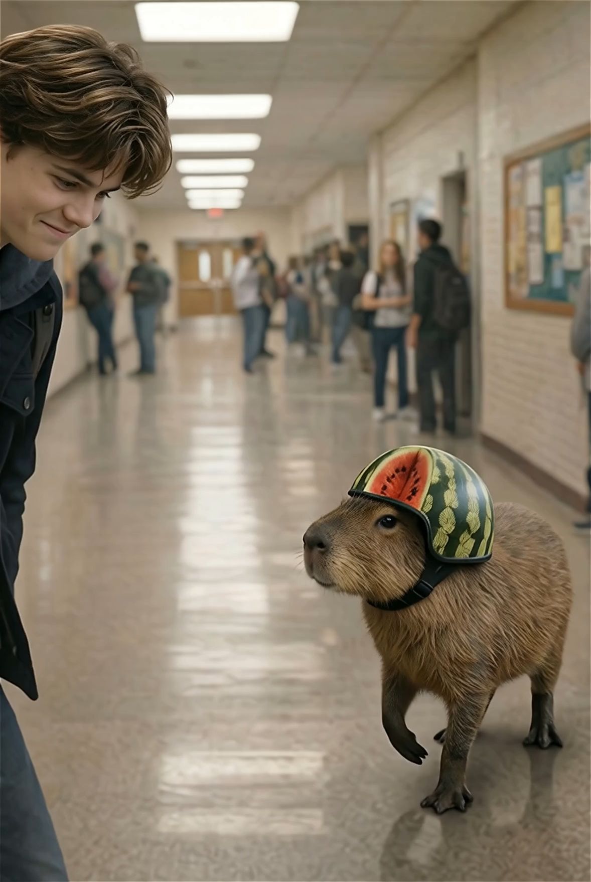 "Then, the capybara crawls away cutely away to the hallway until capybara is not in the scene and the teenager looks happy and Then,he suspiciously ran away