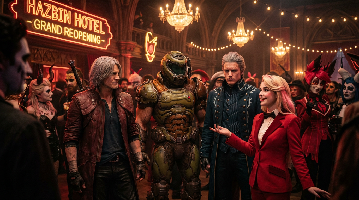 Ultra-realistic cinematic footage-style photo. A lively party taking place inside the Hazbin Hotel. Warm neon lighting, glowing red and gold tones, ornate gothic decor, energetic atmosphere. Doomslayer stands confidently in full detailed Praetor armor, hyper-realistic textures and lighting. Beside him are Dante and Vergil from Devil May Cry, rendered in realistic high-fidelity style—Dante in his iconic red coat with modern leather textures, Vergil in his dark blue coat with intricate patterns and metallic accents. All three characters look natural and grounded in the scene, with cinematic shadows, reflections, and depth. Charlie Morningstar appears realistically reimagined—still recognizable with her pale skin, blonde hair with pink gradients, red bow tie, and long coat—but adapted into a live-action style. She interacts with the group warmly, smiling as she welcomes them to the party. Crowd of stylized Hazbin Hotel demons in the background, softly blurred to maintain focus. Realistic camera lens effect, subtle grain, bokeh lights, dramatic depth of field. Vibrant atmosphere, dynamic posing, polished composition modern cinema style.