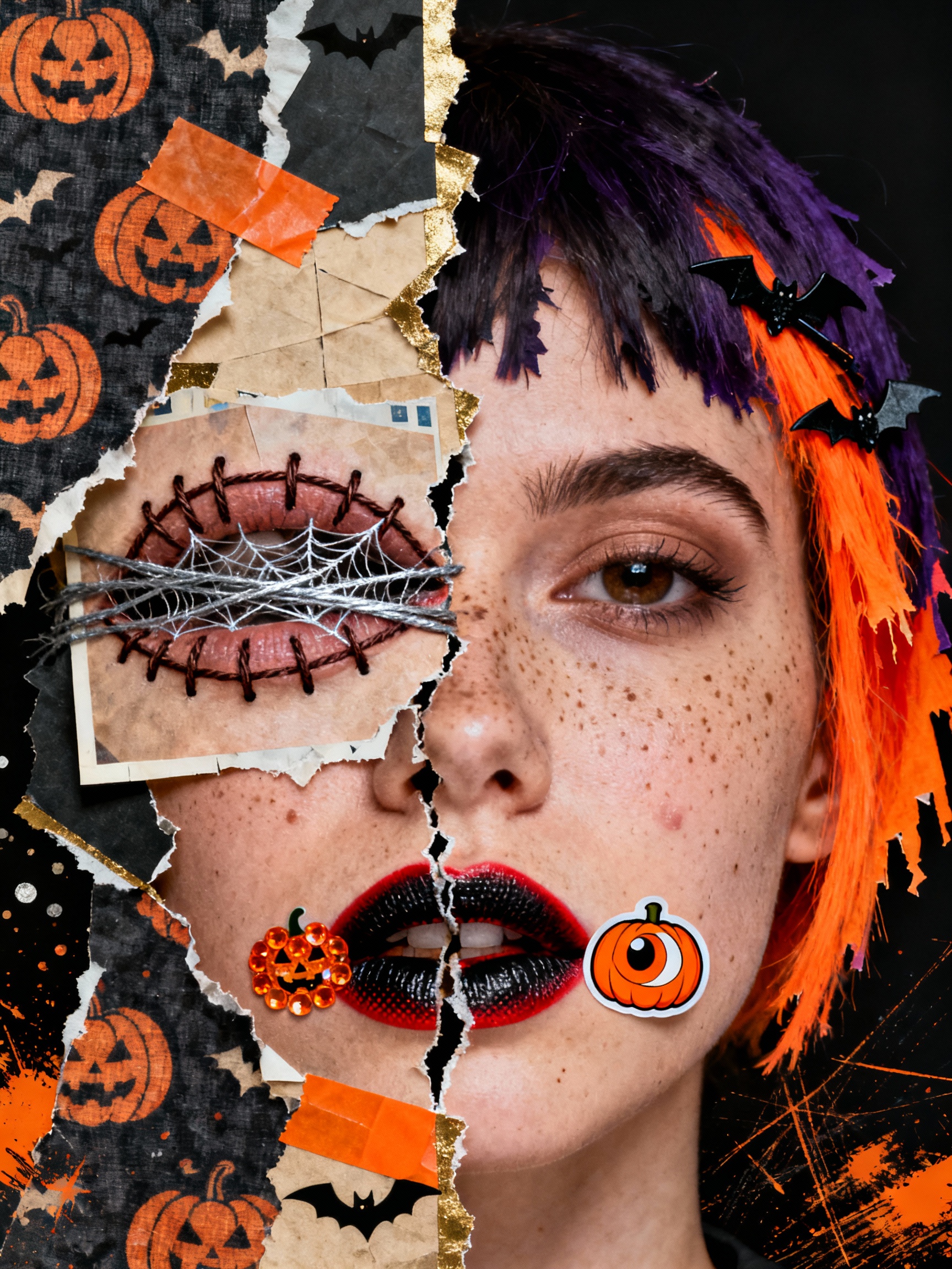 Halloween-themed collage-style portrait with a pure black background to highlight the eerie vibe of the subject; her face is violently torn vertically into multiple collage layers — one mouth is sewn shut, with thick dark brown stitches tightly outlining the lip shape, and silver-gray fine spider webs wrapped around the stitches; the other mouth is clumsily pasted on the cheek like a magazine cut-out, with matte black-red gradient lipstick on the lips and orange pumpkin-patterned sequins stuck at the corners of the mouth. Below the tear, a bright orange cartoon eye pokes out, with a flat halftone texture that creates a strong contrast with the realism of the skin. Her hair is a contrasting combination of dark purple and neon orange, cut roughly with jagged edges like torn paper, and small black bat hair accessories are tucked in the hair. Tape fragments (orange and black) and rough paper seams (dark gold) outline each facial fragment, creating a tactile, fragmented face that resembles a distorted Halloween-themed magazine cut-out. Her skin is cool-toned pale with rich texture, covered in dense dark brown freckles on the cheeks and nose, and pores and natural blemishes are clearly visible; the background layer scans retro textile patterns (dark-patterned pumpkins and bats) and torn paper edges, permeated with copy particles and scratched ink marks (orange and black). The overall simulated collage exudes the beauty of hand printing, combining the roughness of a magazine with the dark Halloween texture. Output images only, no text.