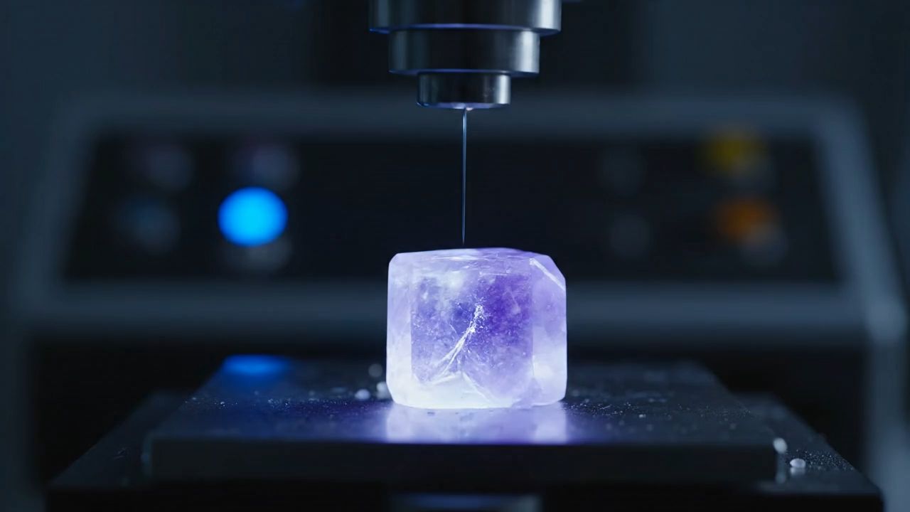 ASMR macro shot: Inside a dark scientific laboratory, a diamond blade slowly slices through a glowing prism of amethyst crystal on a steel platform. Blue sparks scatter, and tiny crystal shards roll across the surface with soft clicks. The echo of the cutting blade, the tinkling sound of fragments colliding, and the faint hum of lab machines create a surreal, dreamy atmosphere.