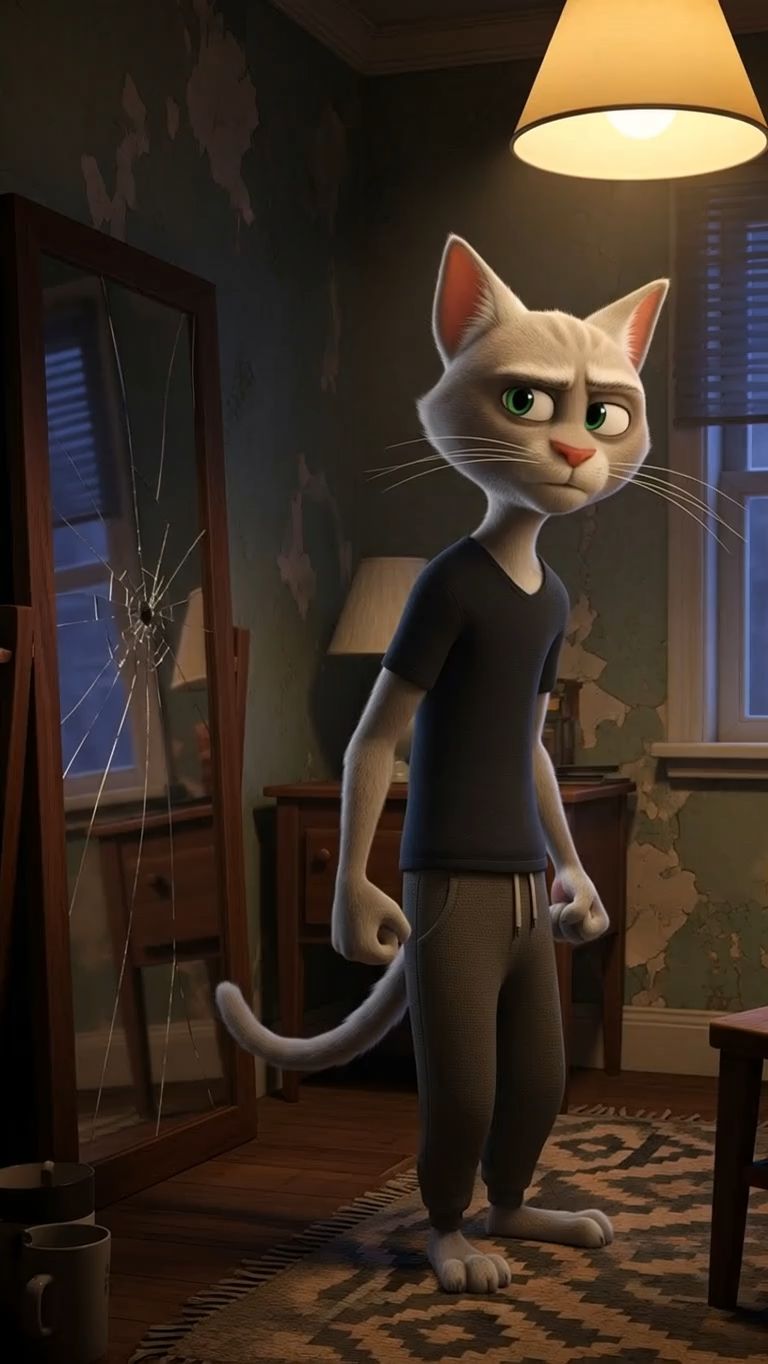 серый кот вдруг начинает мотивироваться и улыбаться с восторгом представляя себя накаченного