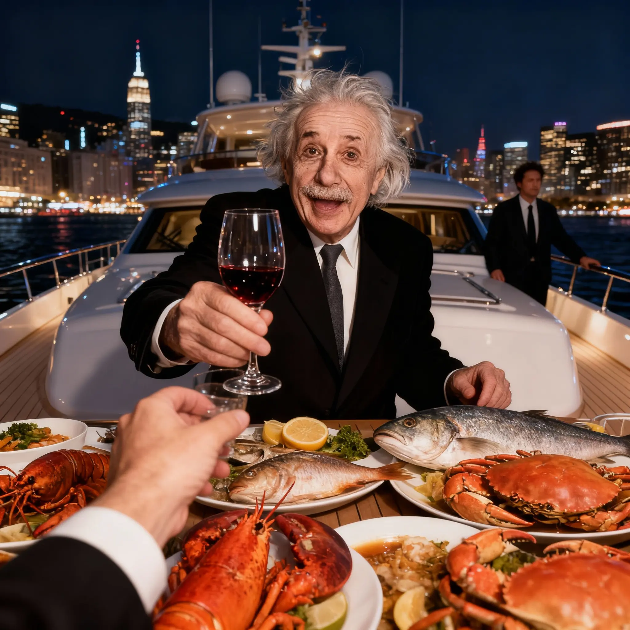 Based on the reference image portrait, generate an image where the man raises a wine glass towards the camera for a toast, from a subjective perspective with one hand extended holding a wine glass to clink with the man, background is a bustling yacht city nightscape, two people on a yacht, with abundant dishes in front including lobster, fish, crabs, highly realistic image that feels like a real photograph. Output images only, no text.