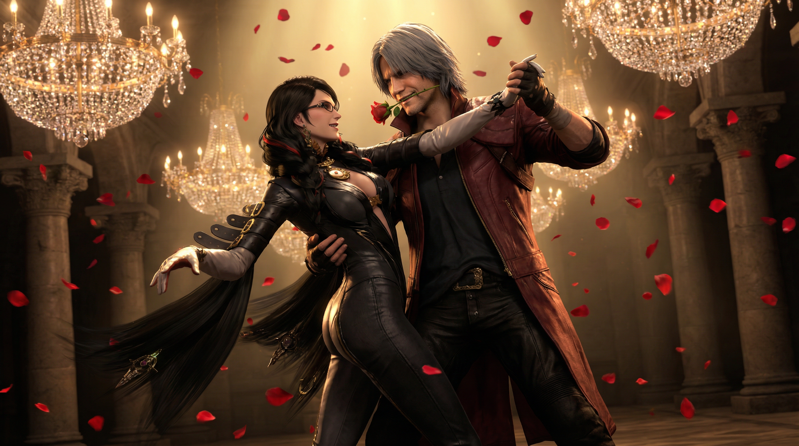 Dante and Bayonetta dancing a fierce, competitive tango in a grand ballroom. Dante in his red coat, holding a rose between his teeth, Bayonetta in her black suit with large cleavage. He spins her dramatically. Rose petals float in the air. Cinematic lighting, elegant, dynamic pose, stylish, smirking at each other, video game character art.
