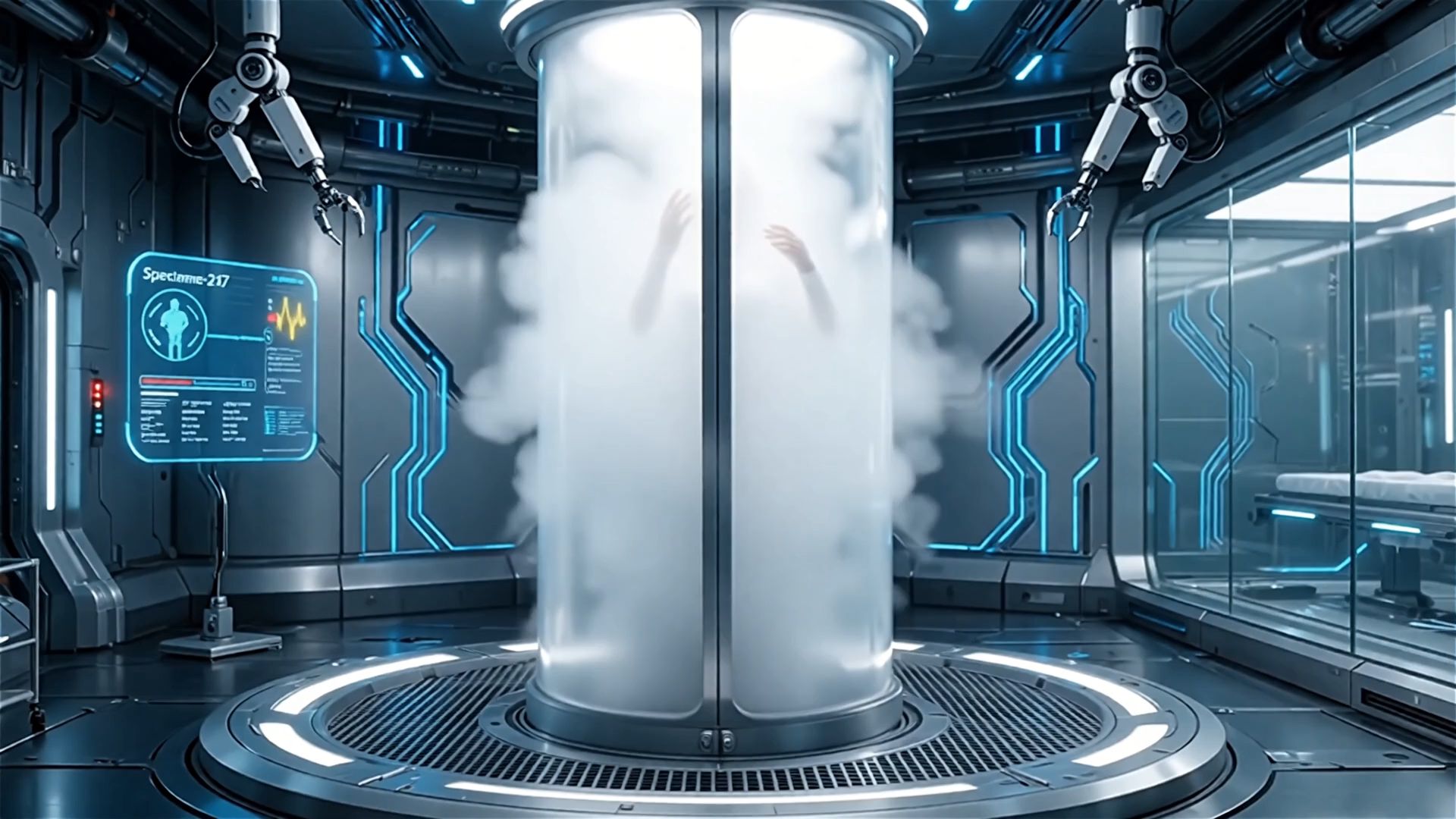 stunning voluptuous blonde american woman with her breasts and privates fully covered in white tape released from a pod cloning machine, sci-fi