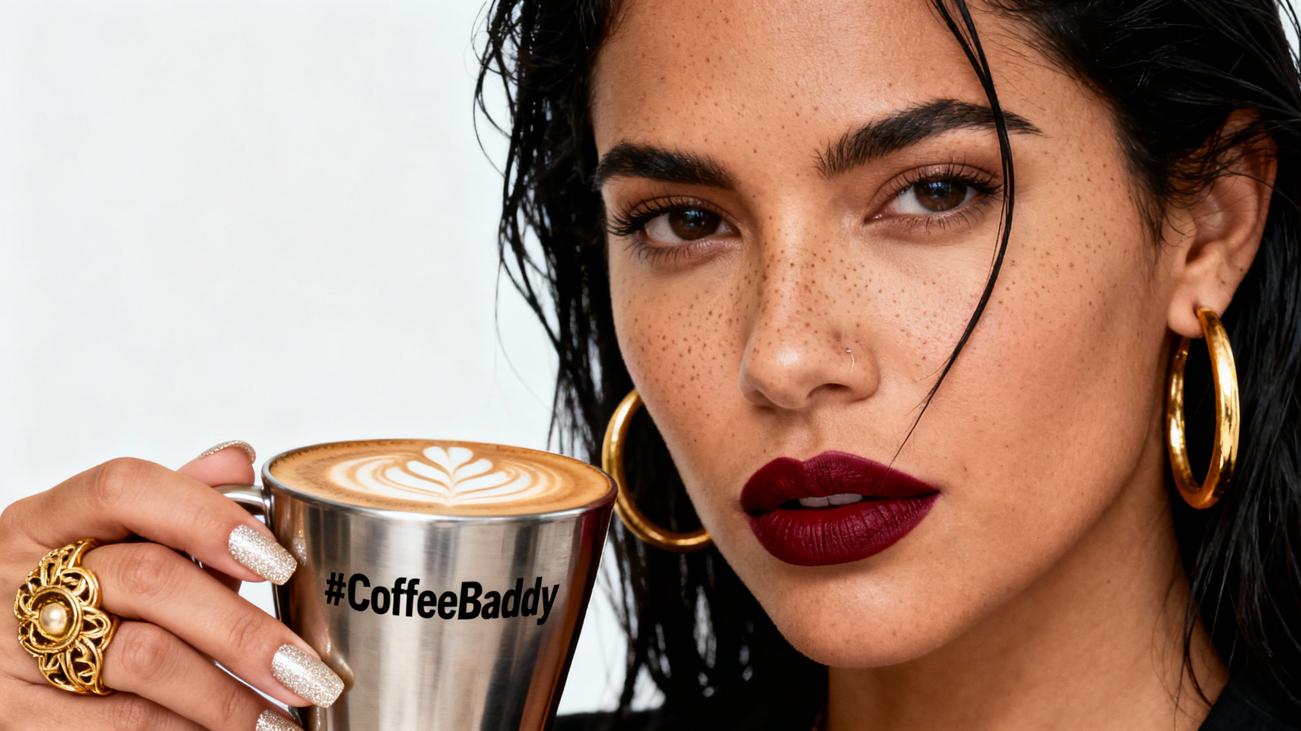 A close-up studio portrait of a beautiful Latina woman with tanned skin and light freckles across her nose and cheeks. She is looking directly into the camera with a neutral, serious expression. Her hair is long and black, and messy with a strand in her face. She is wearing a bold, matte dark red lipstick. Her manicure is bright champagne fake fingernails. She has big golden hoop earrings. On her right hand, she wears an oversized, ornate gold ring and her hand holds a metallic cup of coffee with the text '#CoffeeBaddy' with perfect latte art. The background is pure white.