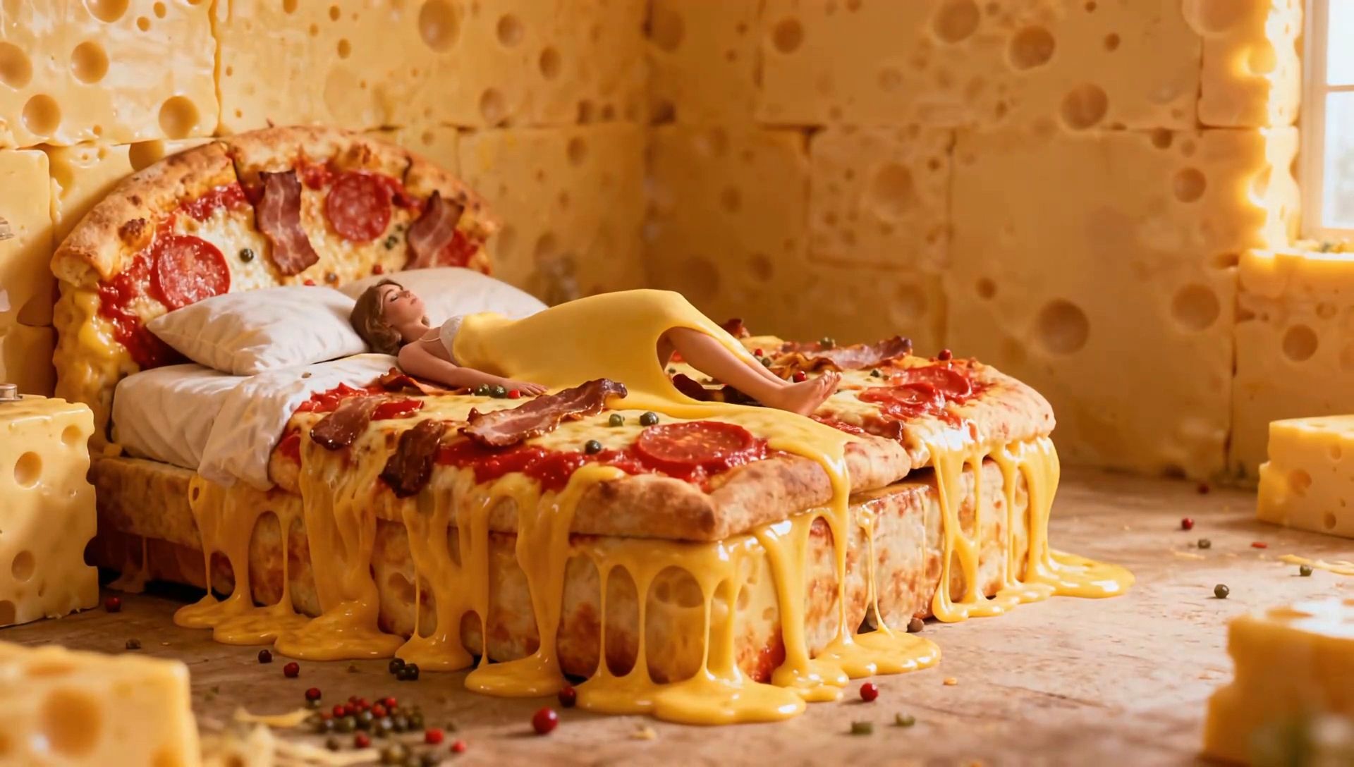 A European woman wearing delicate thin nightwear walks towards a bed made entirely of pizza. The bed consists of a pool of thick, warm, flowing cheese sauce maintained in the shape of a bed by an invisible force field. The surface glistens with a silky sheen and emits a rich pizza aroma. The room, mattress, and pillows are all made of the same pizza cheese material. The woman approaches the bed, pulls back the covers made of thin, stretchable, semi-solidified cheese film with bacon and pepper bits, and lies down, her body gently enveloped by the warm, gooey cheese sauce. The soft lighting creates a mysterious, dreamlike atmosphere.