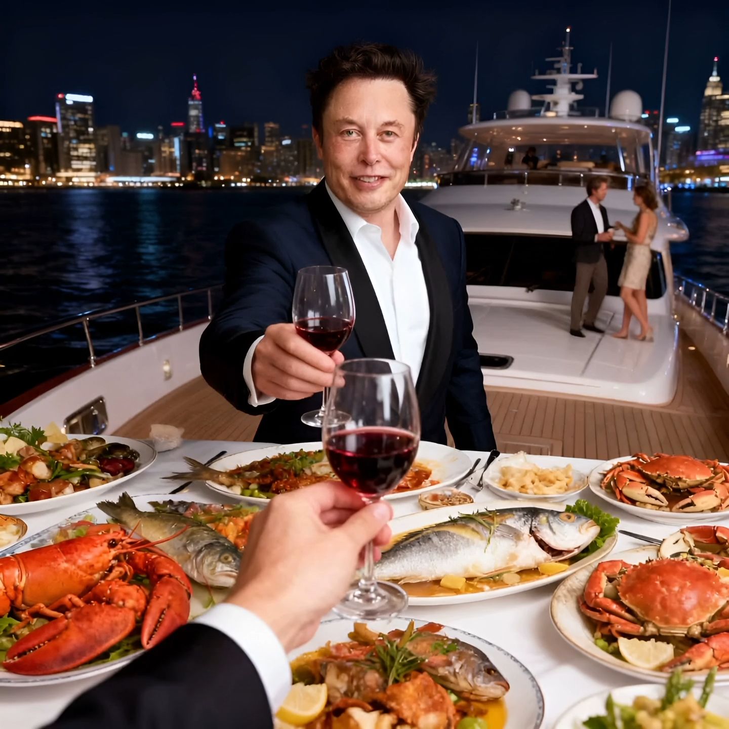 A first-person view of clinking wine glasses with a man on a yacht at night. The man from the reference image is holding up his wine glass towards the camera as another hand enters the frame with a wine glass to toast. They are on a yacht with a luxurious feast of lobster, fish, and crab dishes spread before them. The background shows the glittering cityscape at night.
