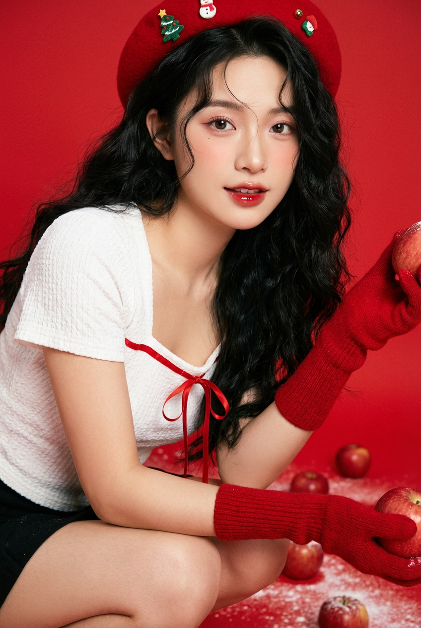 纯红色影棚背景(无多余装饰),背景色调为高饱和正红色,与白色服饰形成强烈撞色对比,突出人物主体;地面散落红色苹果与白色粉末(类似糖粉),强化主题氛围。