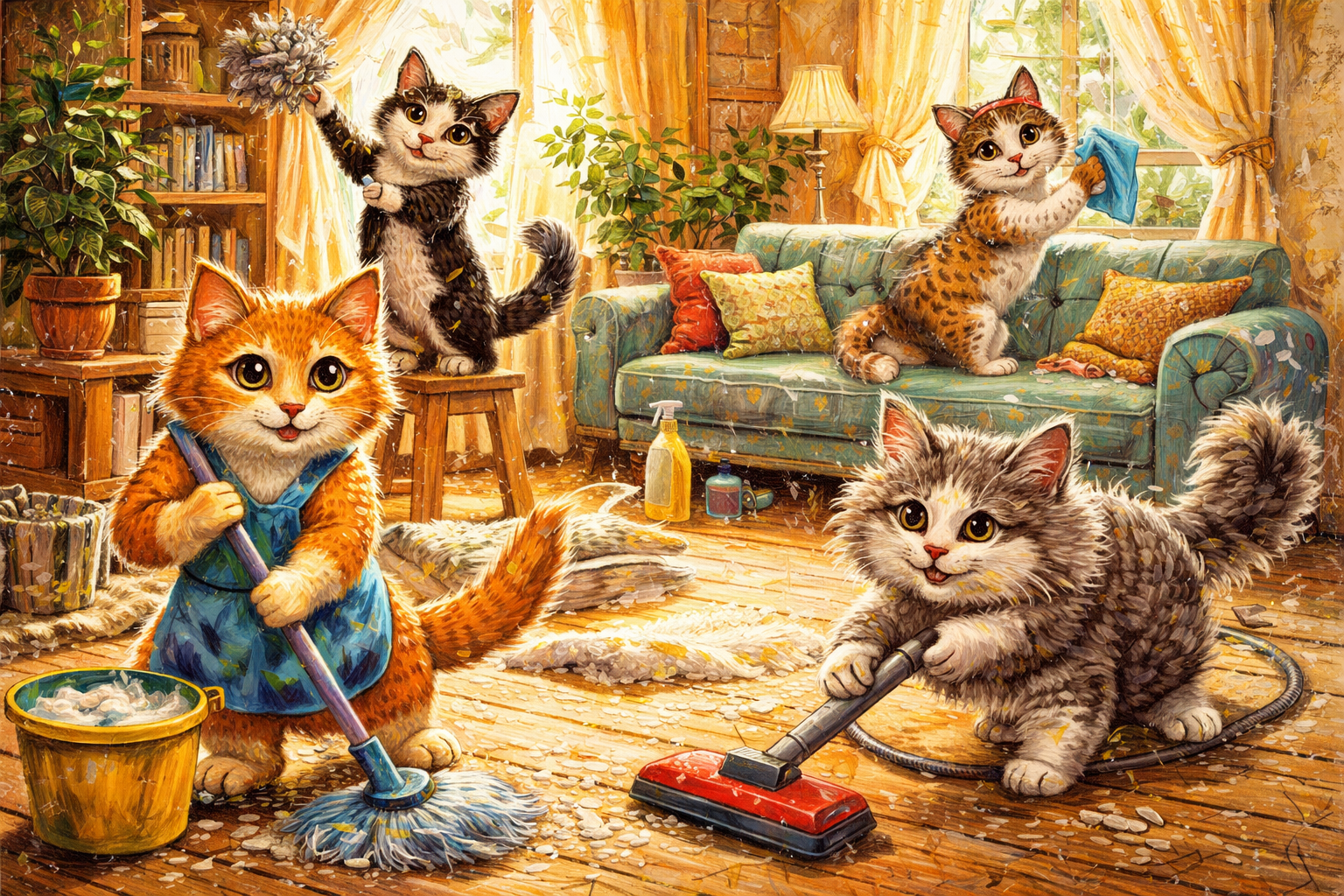 Create a fun, comical illustration of cats cleaning the house using digital painting with an encaustic effect.
