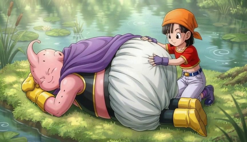 Pan gently massages Majin Buu’s big, fat backside through his diaper-like baggy pants while Majin Buu is peacefully asleep in his balasana position with his