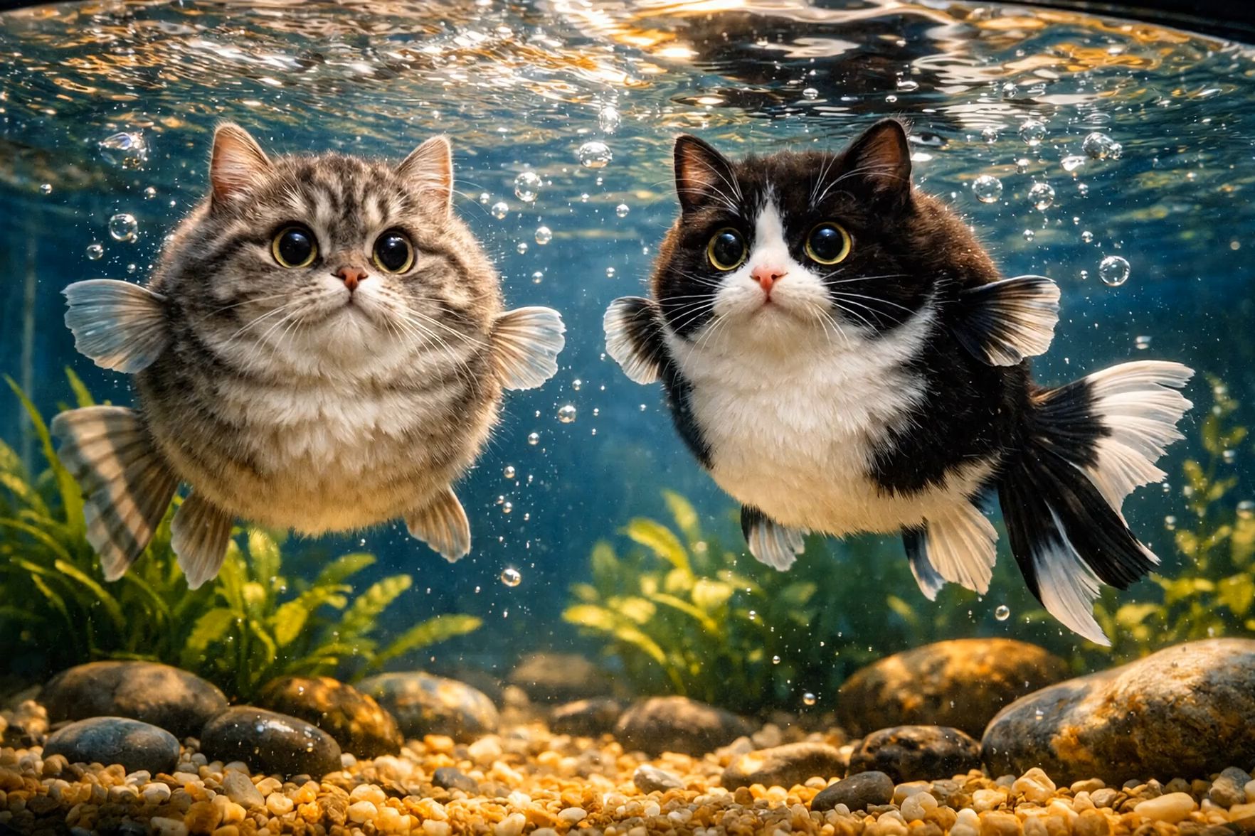Hyper-realistic 4K video animation, fixed low-angle camera looking up through the aquarium glass. Two chubby cats (fluffy gray tabby and black-and-white tuxedo) float calmly underwater like adorable pufferfish, with huge spherical bodies, no legs—replaced by delicate translucent fish fins (pectoral front fins, dorsal and flowing caudal tail fins matching their fur colors and patterns). They slowly start to "swim" playfully: fins gently waving and fluttering, tails undulating smoothly, whiskers twitching, eyes blinking, small bubbles rising faster as they move closer together, nudge each other softly, then drift apart again. Water ripples softly on the surface, plants sway lightly, light caustics dance across their fur-fin blend, gravel shifts subtly. Soft ambient bubble sounds, gentle water movement. High detail on underwater fur-to-fin transition, fin translucency and motion, bubble trails, plant sway, and lighting refraction. Professional VFX style for cute, surreal, heartwarming "cats as fish" fantasy