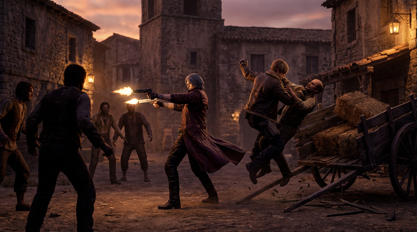 Action scene in a rural Spanish village at dusk. Dante stylishly shoots a crowd of Ganados with Ebony & Ivory, his coat flaring. Leon, in his bomber jacket, is in the foreground expertly suplexing a Villager into a wooden cart. They are fighting back-to-back. Moody, gritty atmosphere with dramatic shadows, inspired by both game's art styles.