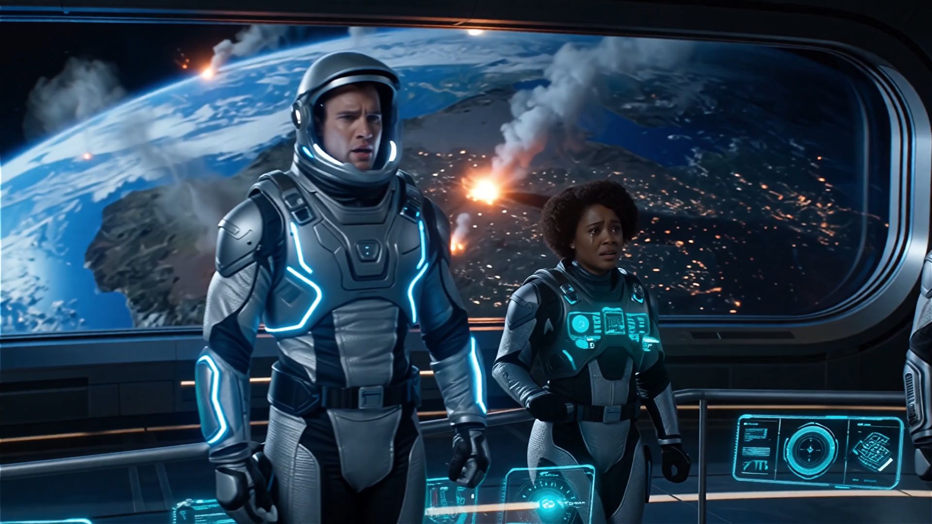 429. In a futuristic space station, the astronauts stand in awe before a massive viewport, witnessing the catastrophic destruction of Earth as fiery meteors smash into its surface. The crew, clad in sleek, glowing-tech suits, watches silently, their expressions a mix of shock and determination. The camera slowly pans across the group, lingering on their wide-eyed wonder. Behind them, holographic interfaces glow faintly, illuminating the metallic floor.