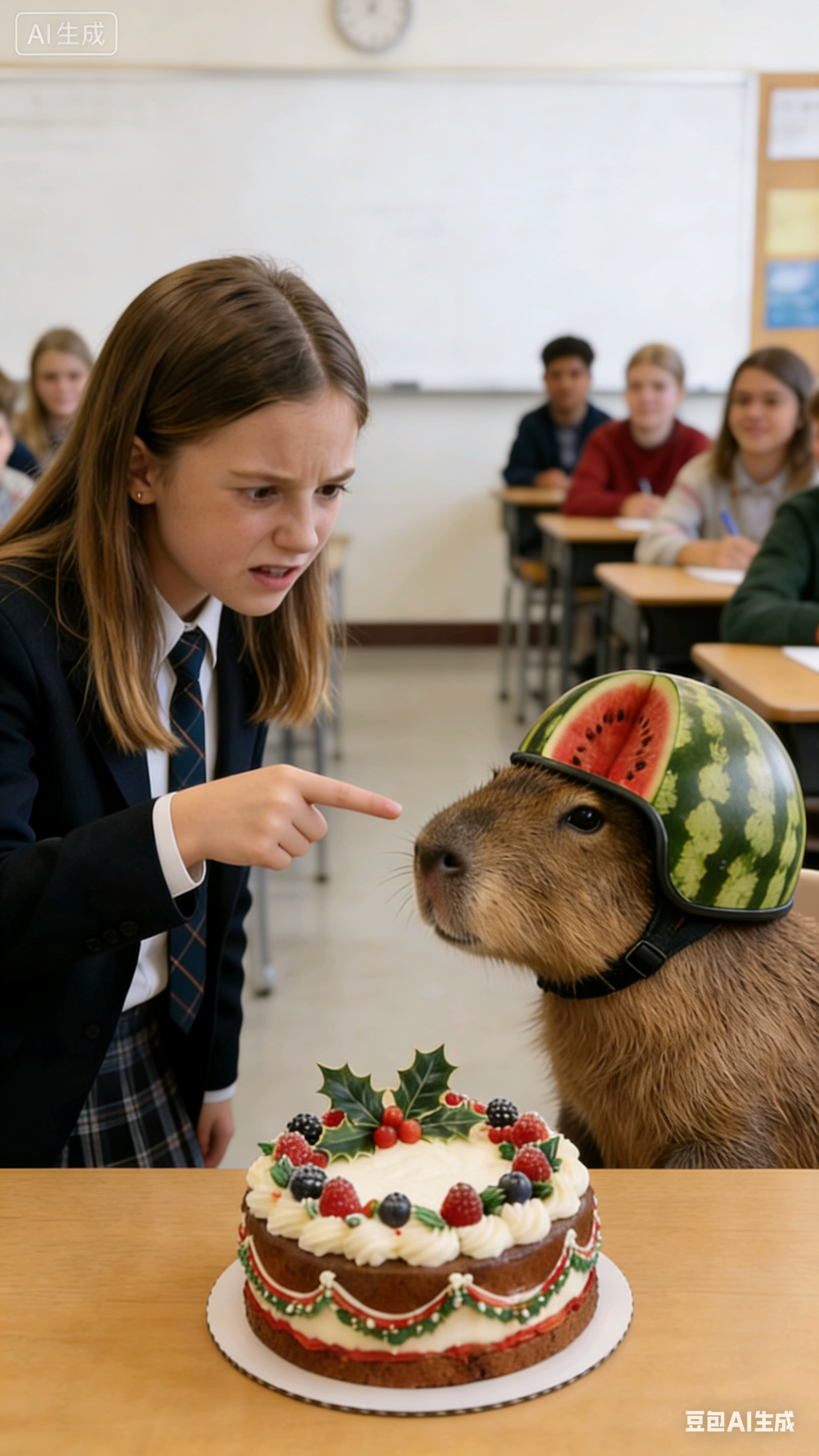 While the owner is away, someone angrily yells, "Why are you eating my Christmas cake, you stupid rat? Get out of here!"—seemingly accusing the capybara of stealing it.