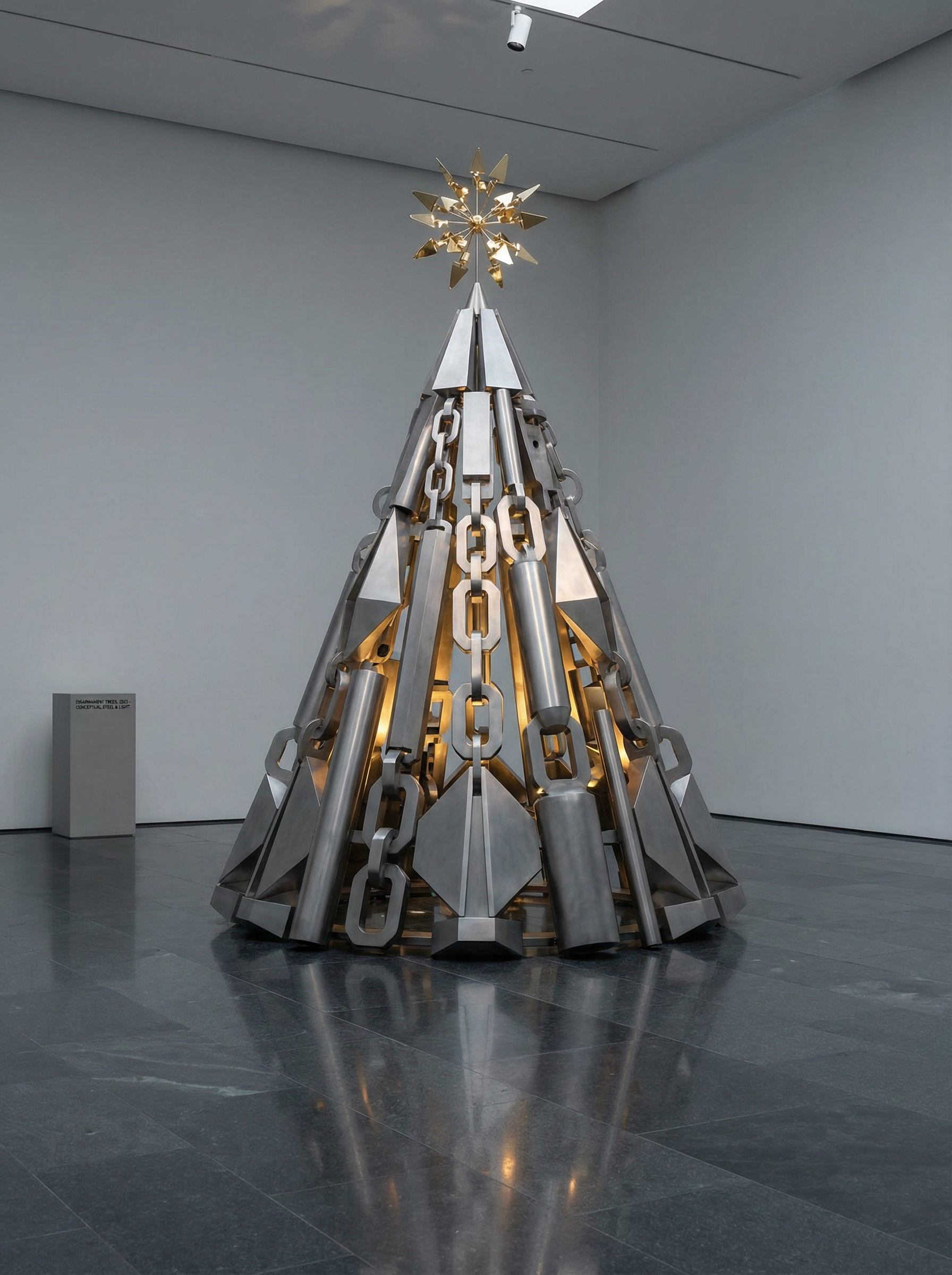 A high-concept contemporary art installation of a Christmas tree entirely formed from deconstructed weapon components, reassembled into an elegant geometric metal sculpture.
