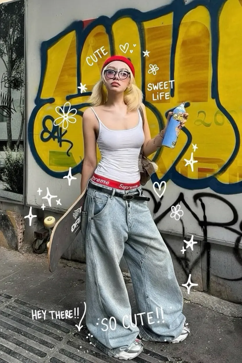 Transform the uploaded photo by adding a cute hand-drawn doodle overlay style with playful white line drawings around the person. Include stars, hearts, flowers, sparkles, and fun text like 'CUTE', 'SWEET LIFE', 'SO CUTE!!', 'HEY THERE!!'. The doodles should look casual, fun, and natural, enhancing the photo with a light and youthful vibe. Output images only, no text.
