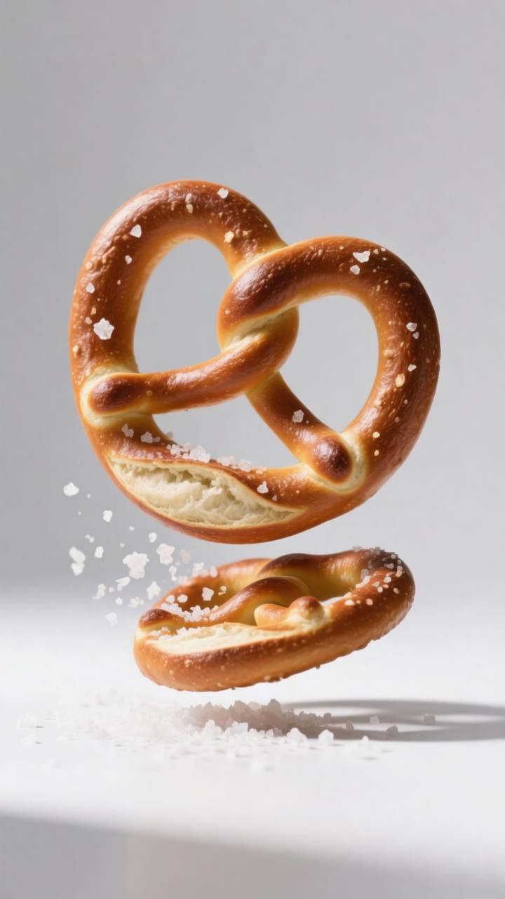 Bavarian Pretzel, premium food advertising, white seamless background, high key studio lighting, floating stacked composition, levitating pieces, gritty salt scattered, clean minimal layout, crisp soft shadow on surface, ultra realistic, macro product photography, 100mm lens look, f/8 sharp focus, subtle texture detail, editorial commercial, 8k