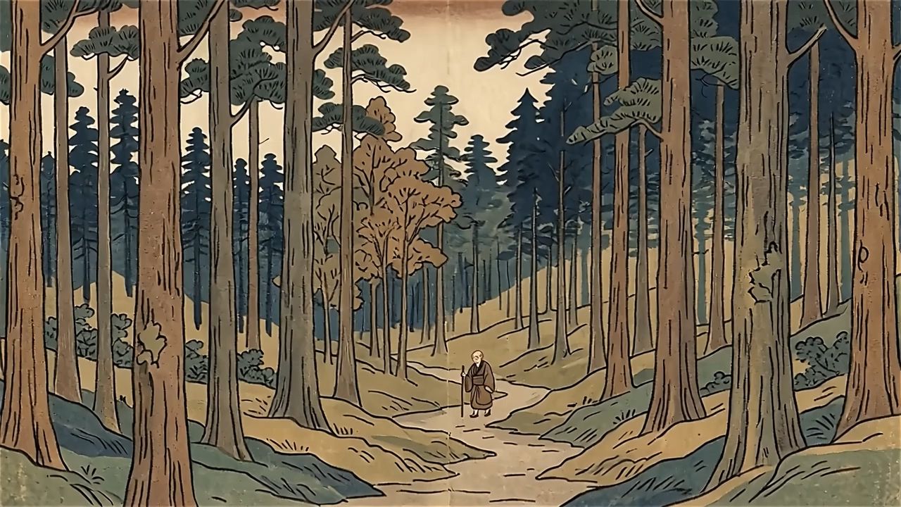 the aged monk walks slowly along the path toward camera. Camera is locked. Birds sing in the trees