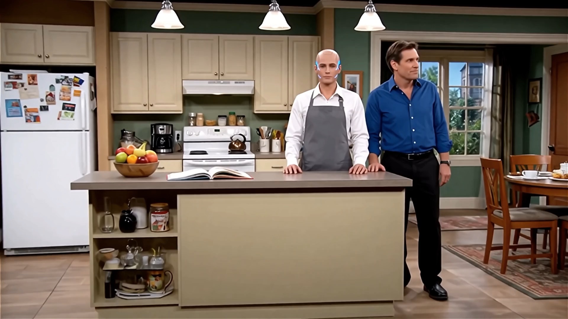Wide shot of a kitchen sitcom set. An AI character and a human stand at a counter. Camera static.