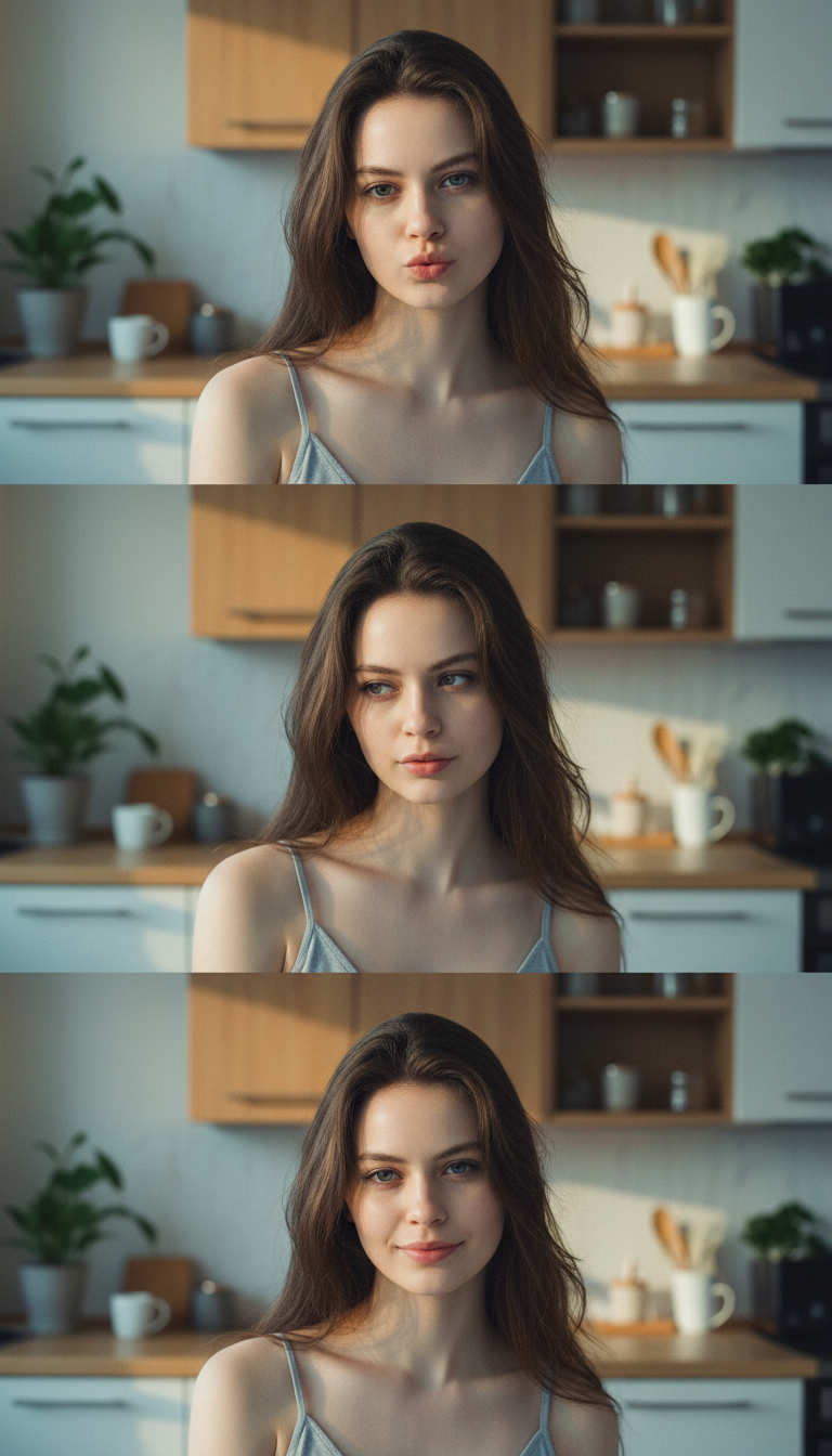 Combine three portrait images vertically into a single 9:16 canvas creating a continuous visual narrative. The composition shows the same subject at different emotional moments in warm, cozy IKEA-style interior space with kitchen elements and home decor. Soft ambient light from front-side angle creates natural glow on skin. Cool white color tone conveys light, fresh, airy mood. First image shows playful expression with pursed lips and direct gaze. Second image shows gentle side turn with tilted head and subtle emotion. Third image displays relaxed soft smile with natural hair fall. Subject wears light gray-blue camisole with thin straps. Lighting is soft and even without harsh shadows, skin has smooth texture with gentle reflective glow reminiscent of soft-focus film aesthetic. Natural loose hair with soft volume catches light gently. Eyes are expressive with engaging gaze, slim natural nose, full lips with light pink tone. Overall atmosphere is natural, warm, peaceful like late morning sunlight capturing genuine unguarded moments. Output images only, no text.