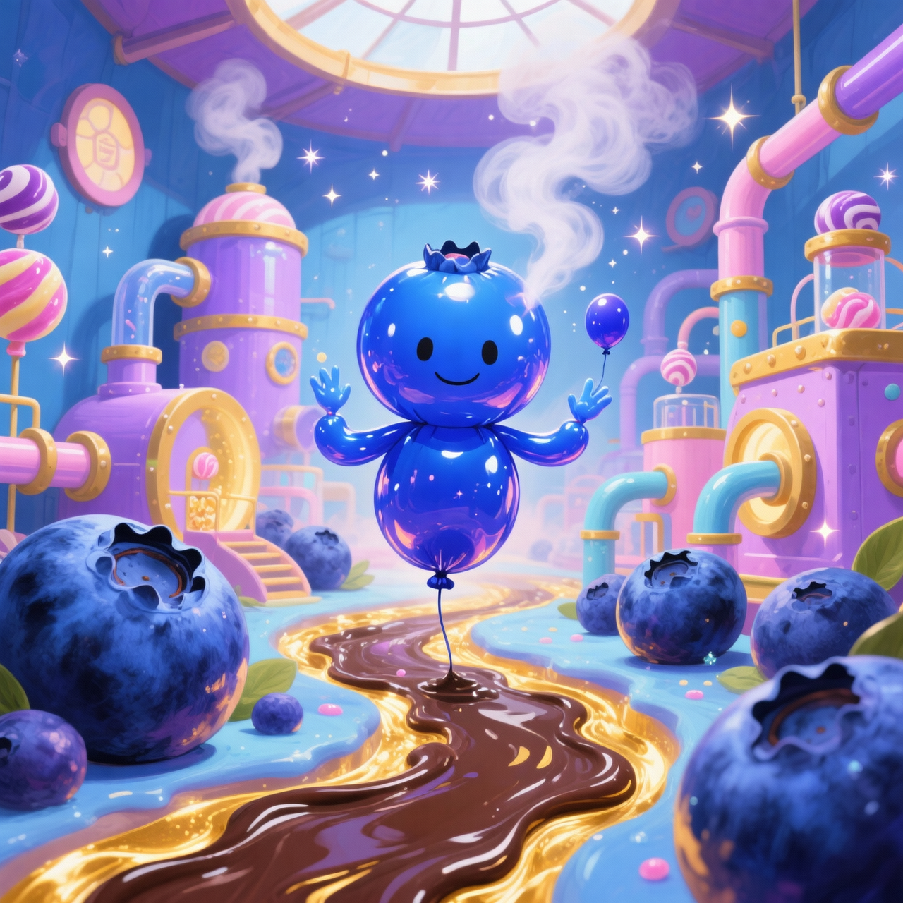 A whimsical fantasy candy factory interior with a surreal blueberry theme. A glowing chocolate river flows through the scene, surrounded by oversized blueberries, candy pipes, and pastel machinery. A playful fantasy figure made of glossy blue tones appears mid-transformation, balloon-like and magical, without showing a recognizable face. Bright saturated blues and purples dominate the scene, with warm golden highlights, soft steam, sparkles in the air, and a dreamy storybook atmosphere. Painterly, cinematic, imaginative, and nostalgic