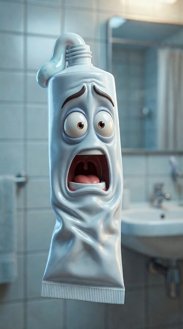 شخصية كرتونية 3D لأنبوب معجون أسنان معصور من آخره، بيحس بالألم وبيتكلم بصوت درامي ساخر، عينيه معبرة جدًا ووشه متكسر من الوجع، أسلوبه مصري شعبي، عصبي شوية بس مضحك، بيبالغ في التعبير عن الألم.