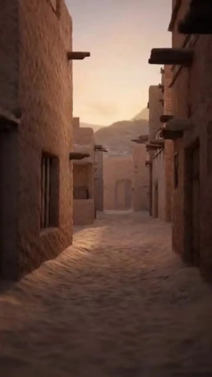 Shots: ancient Mecca and Medina styled like the “Omar” series—sand paths, old houses, dawn light—blended with smooth scientific shots of the human brain and neural activity.