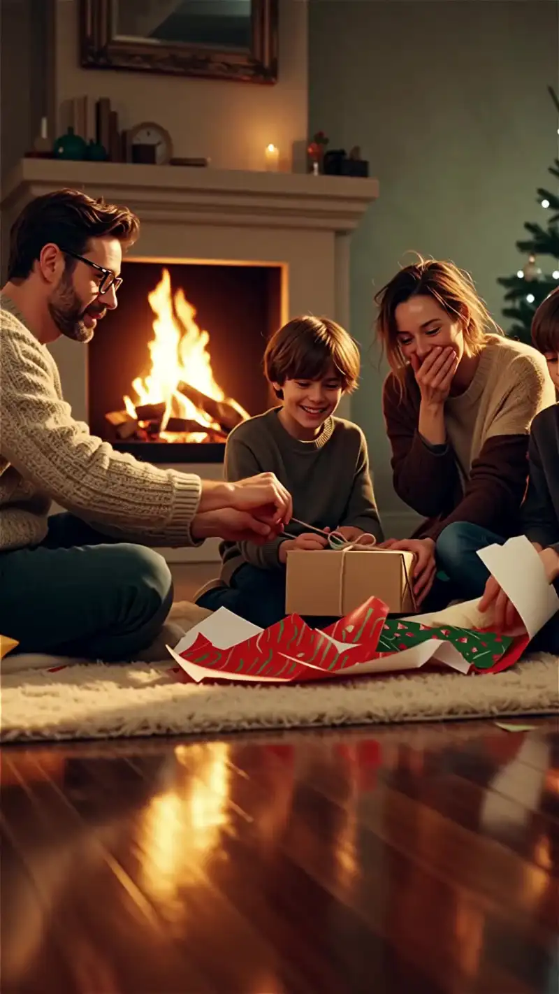 Warm fireplace light flickers across their faces, creating soft golden highlights and gentle shadows. Wrapping paper tears slowly, ribbons fall, and joyful reactions unfold naturally — laughter, surprised smiles, and shared glances.