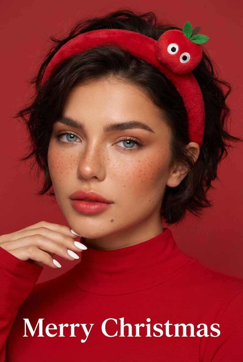主体造型:少女留着蓬松的深棕短发凌乱,侧边搭配红色毛绒小苹果造型的粗发箍(苹果造型带有黑色眼睛、绿色装饰细节),身着同色系红色高领服饰,整体风格适配圣诞氛围; 妆容与细节:妆容以清透的暖调腮红点缀一点小雀斑、淡红色唇妆为主,手部露出的白色美甲与红色造型形成柔和对比; 场景与标识:背景为简洁的红色调,画面底部标注“Merry Christmas”字样,契合写真摄影的风格定位。32K细腻真人皮肤纹理、摄影大棚光感,光影通透。保持参考图人像不变。