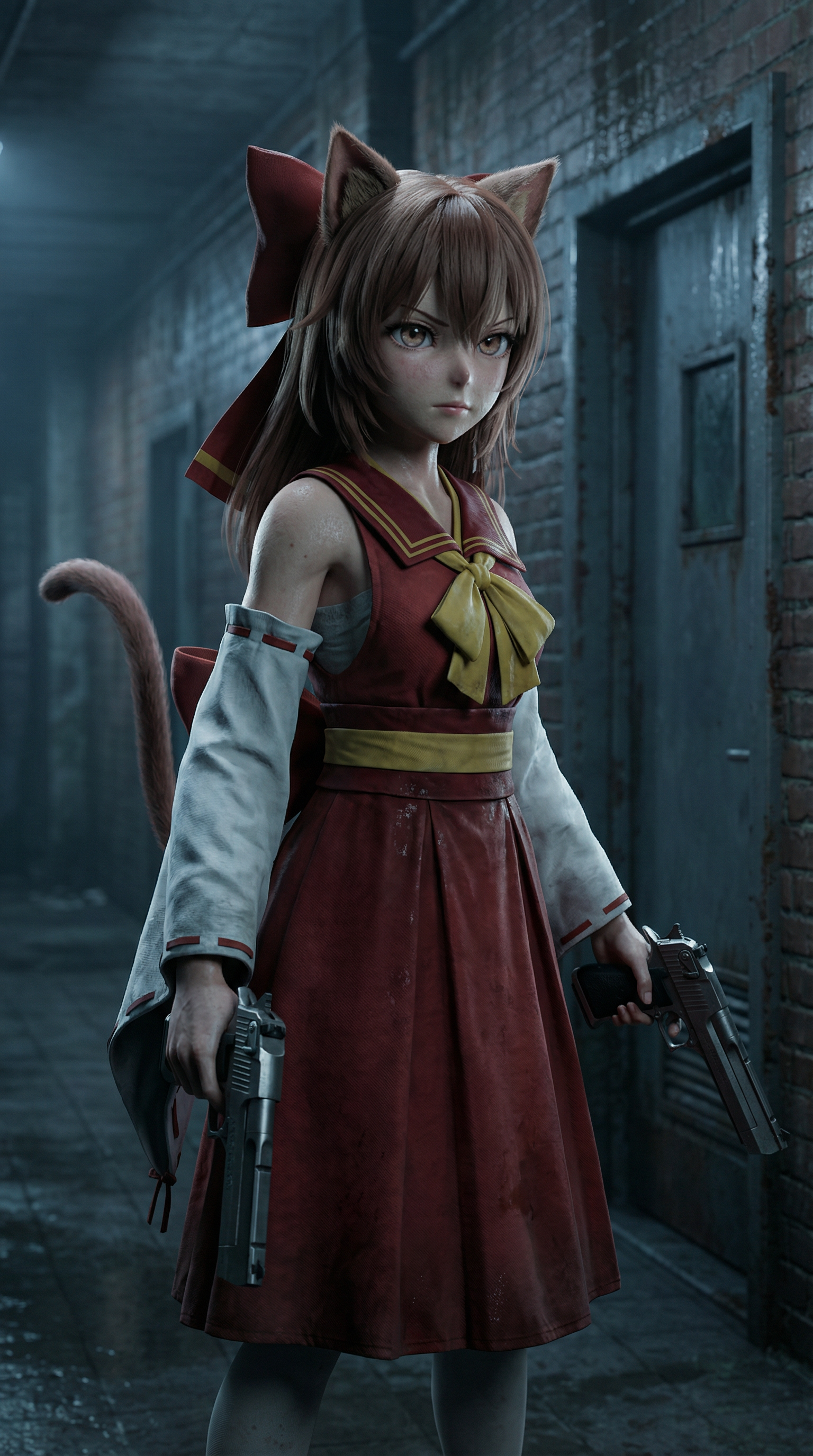 请参考角色外观与面貌,写实3D渲染,角色身处昏暗的浣熊市建筑走廊内,左右手上各拿着沙鹰手枪,皮肤质感逼真,面部细节清晰,眼神锐利,环境为潮湿的砖墙与金属门,冷色调光影,电影级镜头,景深效果,Unreal Engine 5渲染,8K分辨率