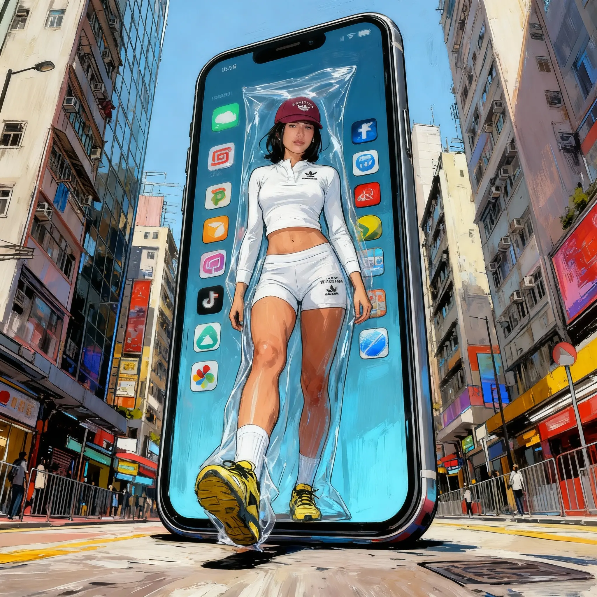 The character in the picture, with the same clothing and appearance, is sealed in a huge full-screen mobile phone. One foot steps out of the screen and steps on the ground. The APP icons in the phone are squeezed to both sides of the body. The huge phone stands in the city street scene. The composition is low-angle, CG+impasto+sharp brush+Hong Kong comics. Output images only, no text.