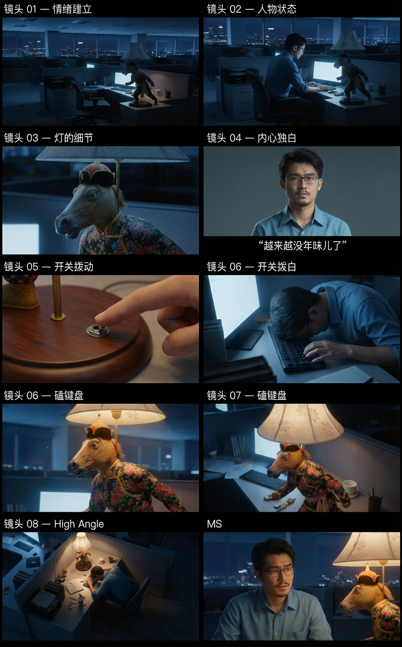 生成9宫格分镜图,图1是阿强,图2是人马灯,图3是场景。镜头 01 — 情绪建立